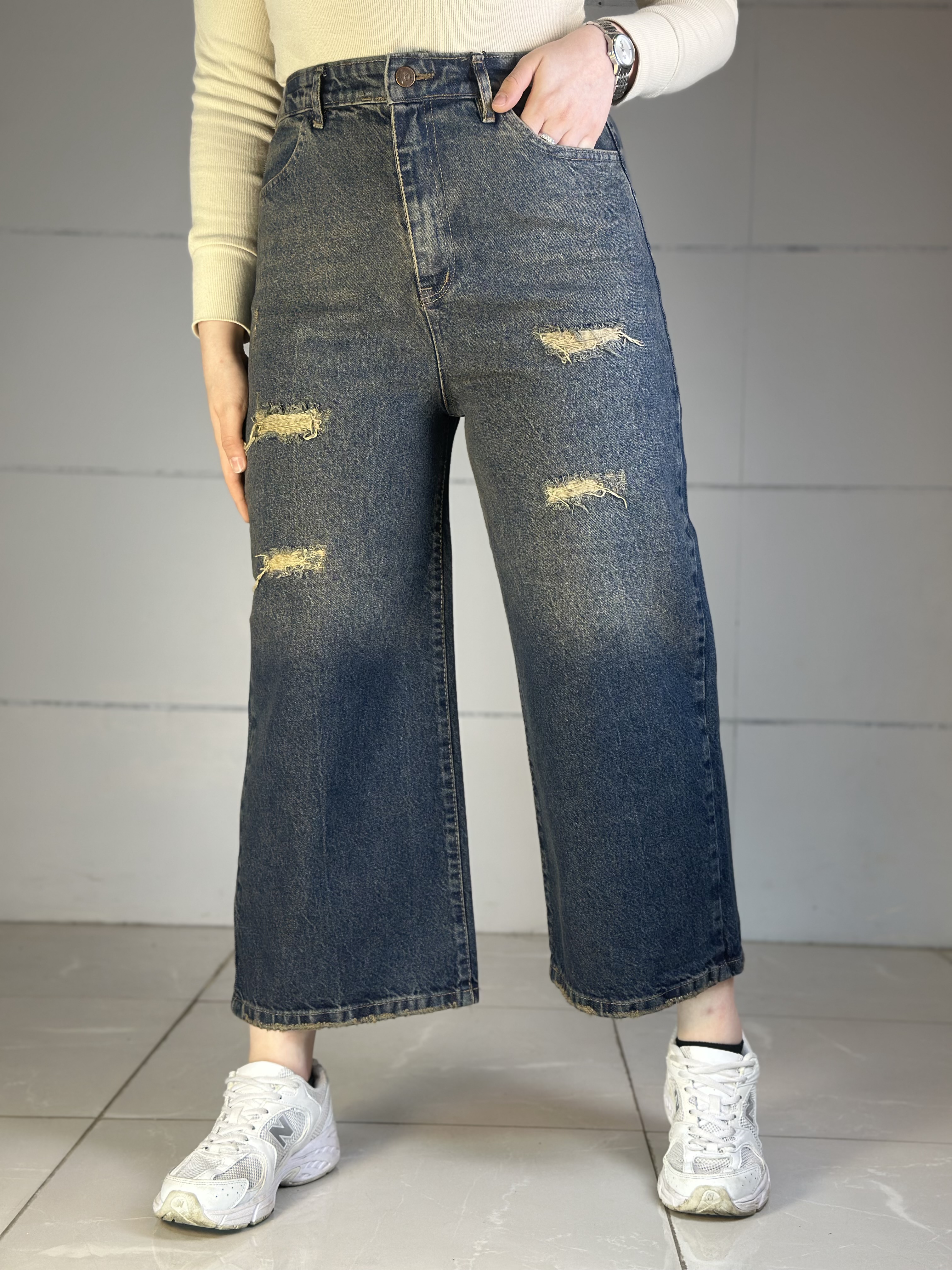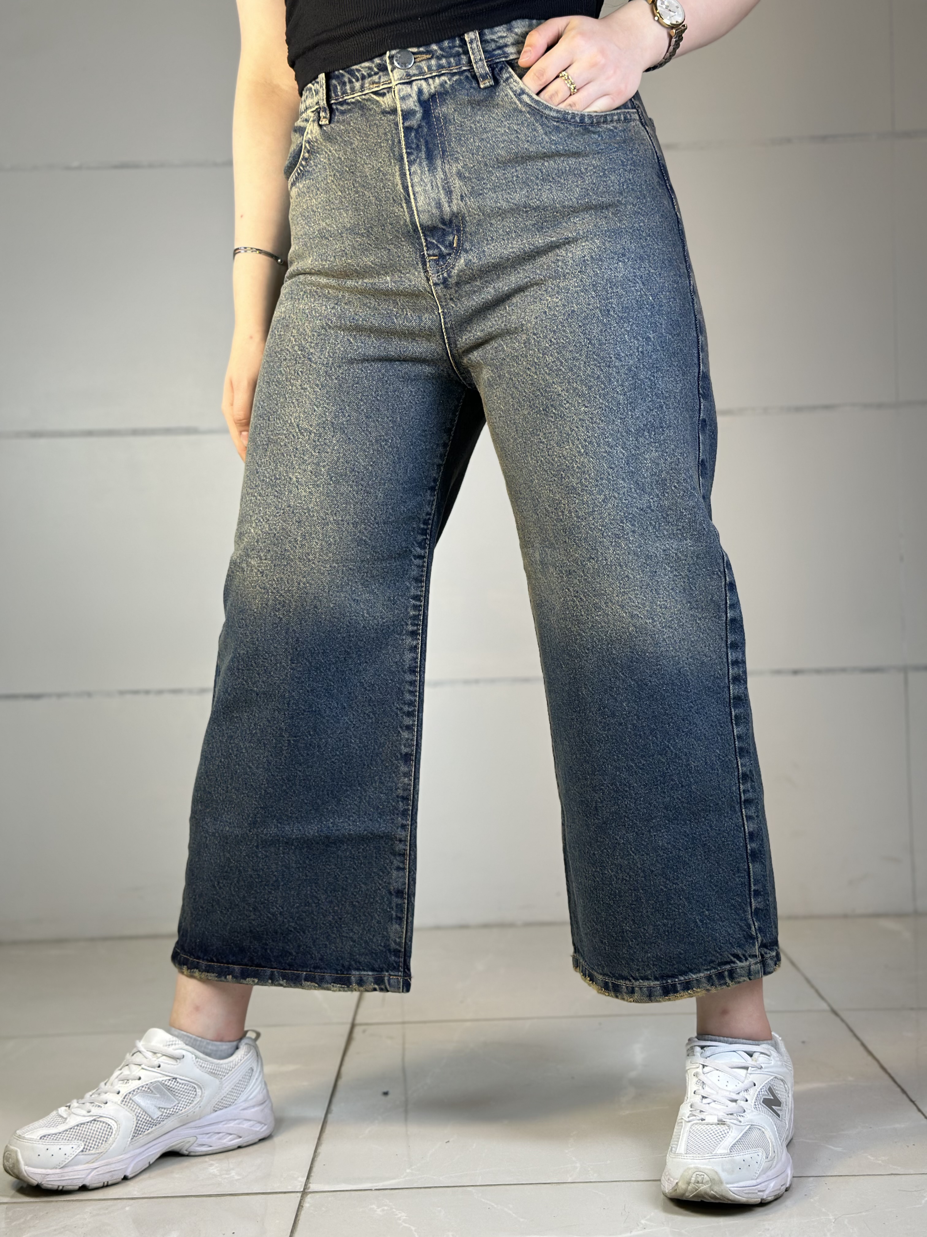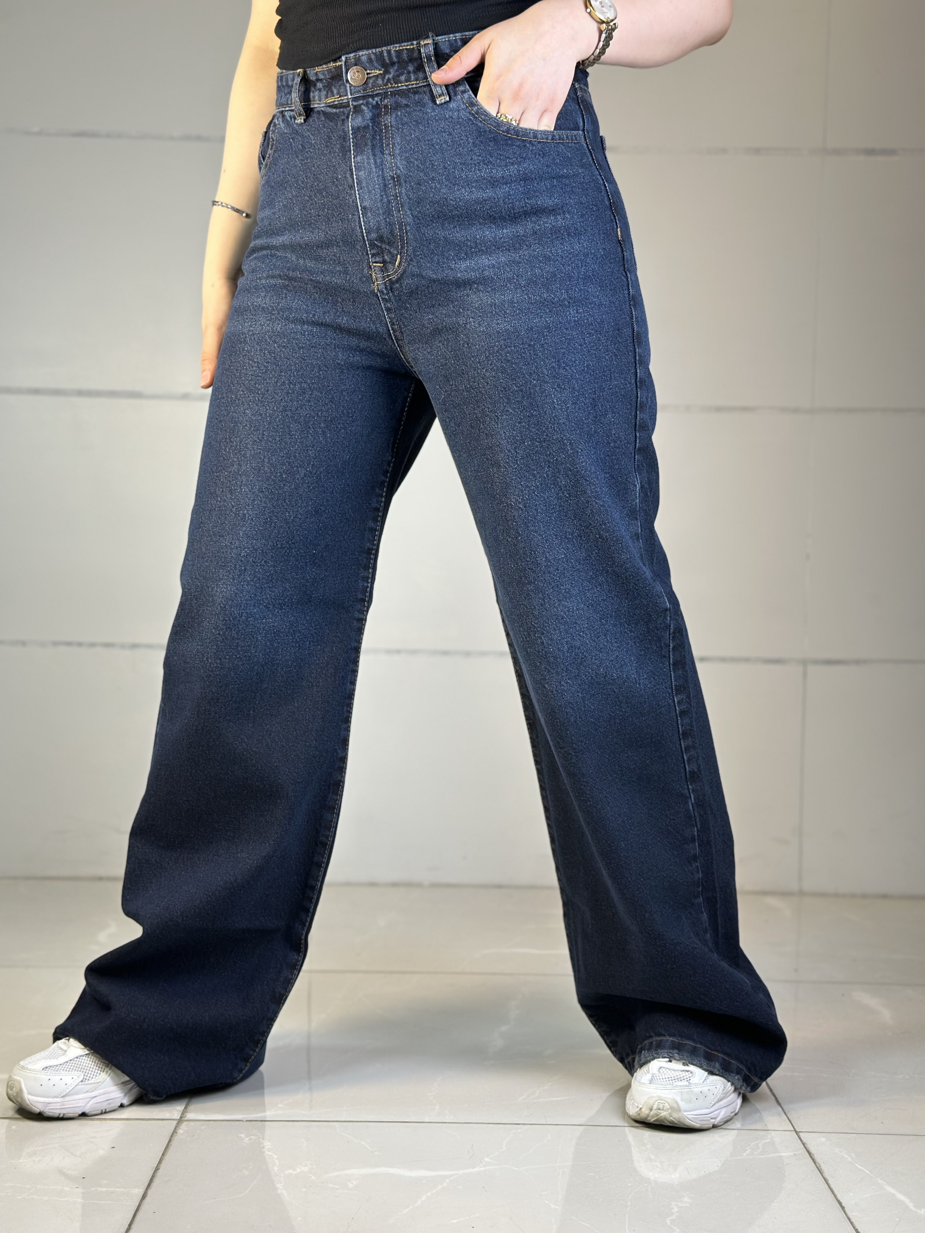 شلوار جین واید لگ پشت کش زاپدار سرمه ای سنگشور سایه روشن