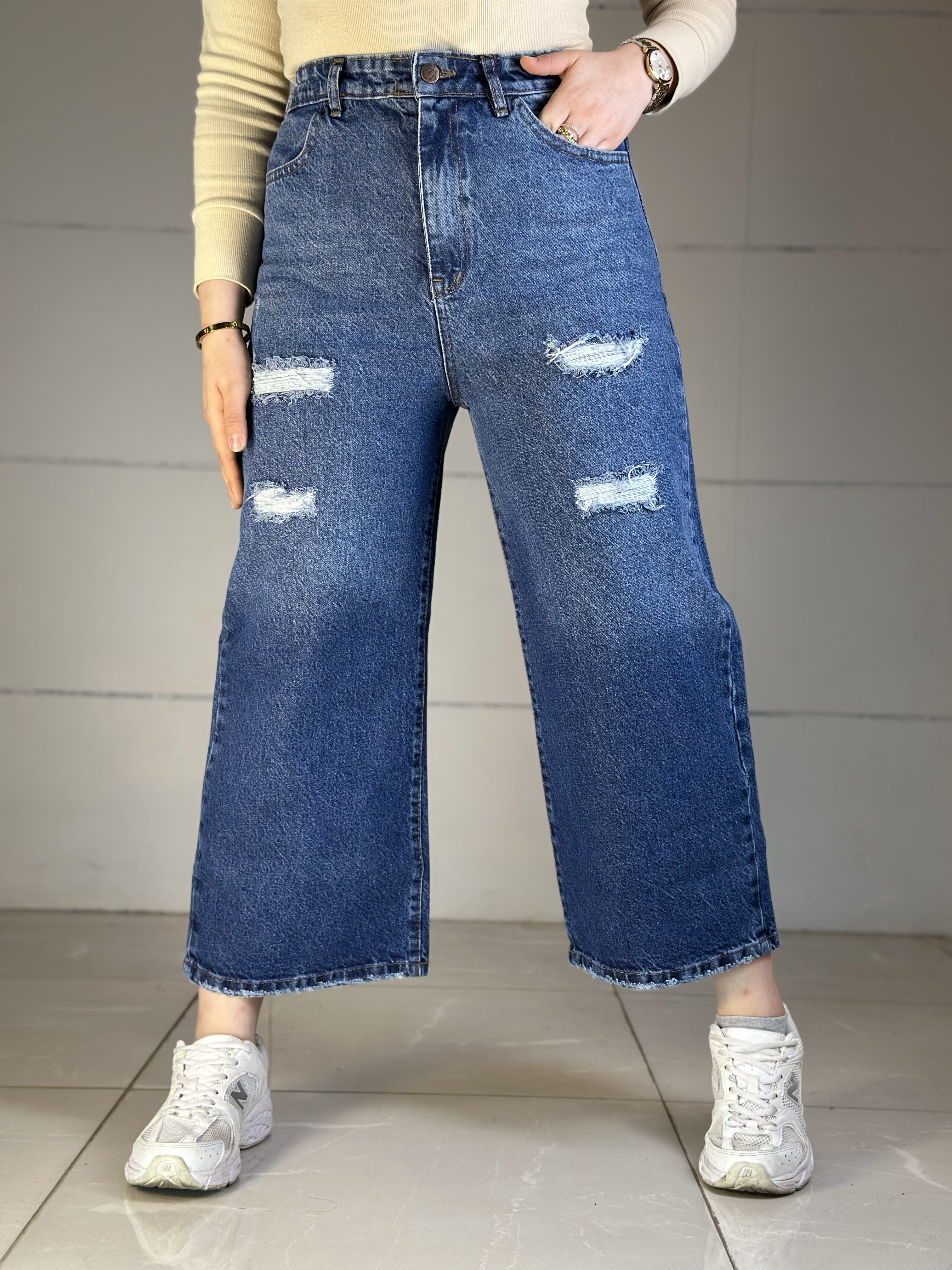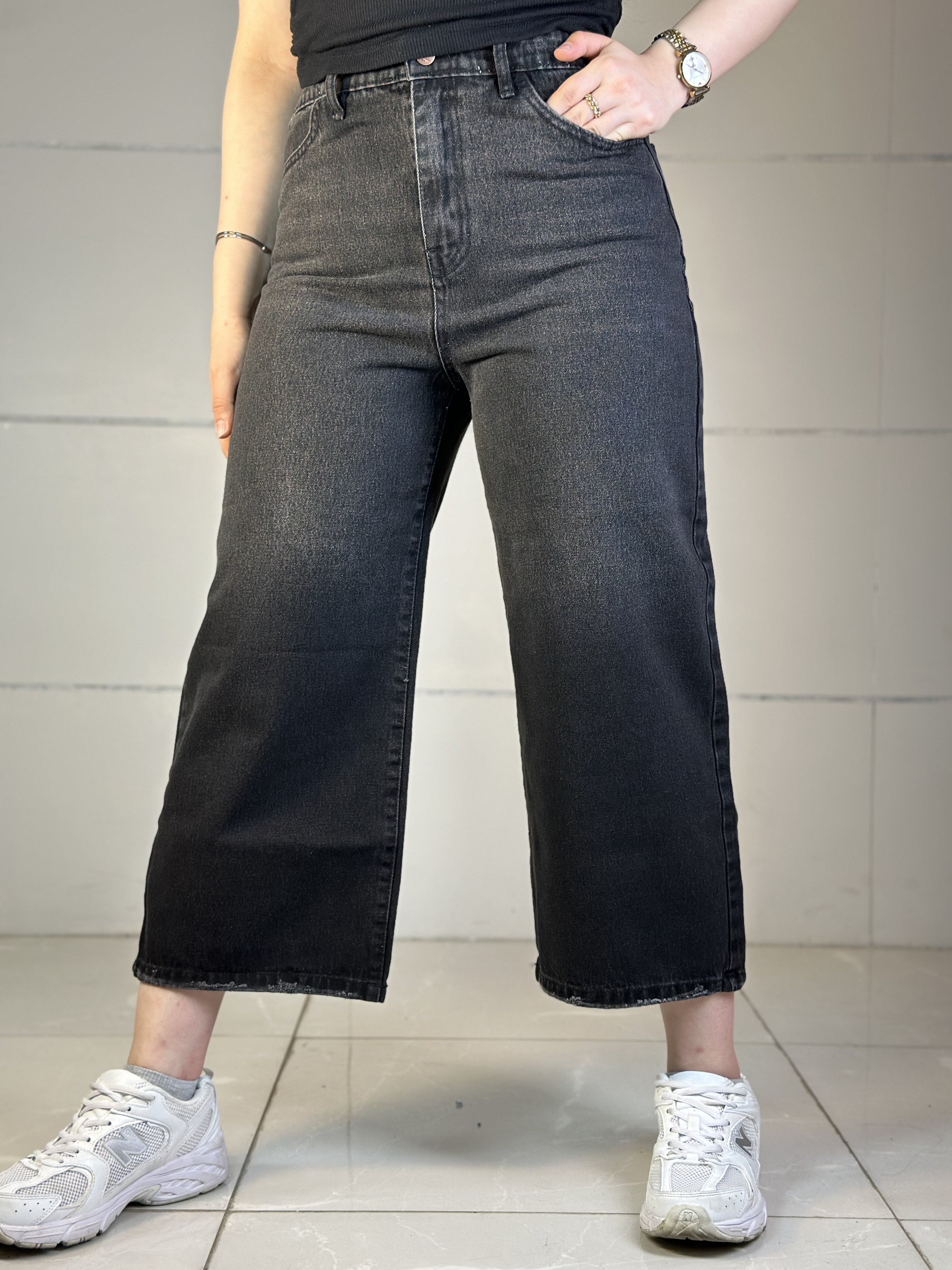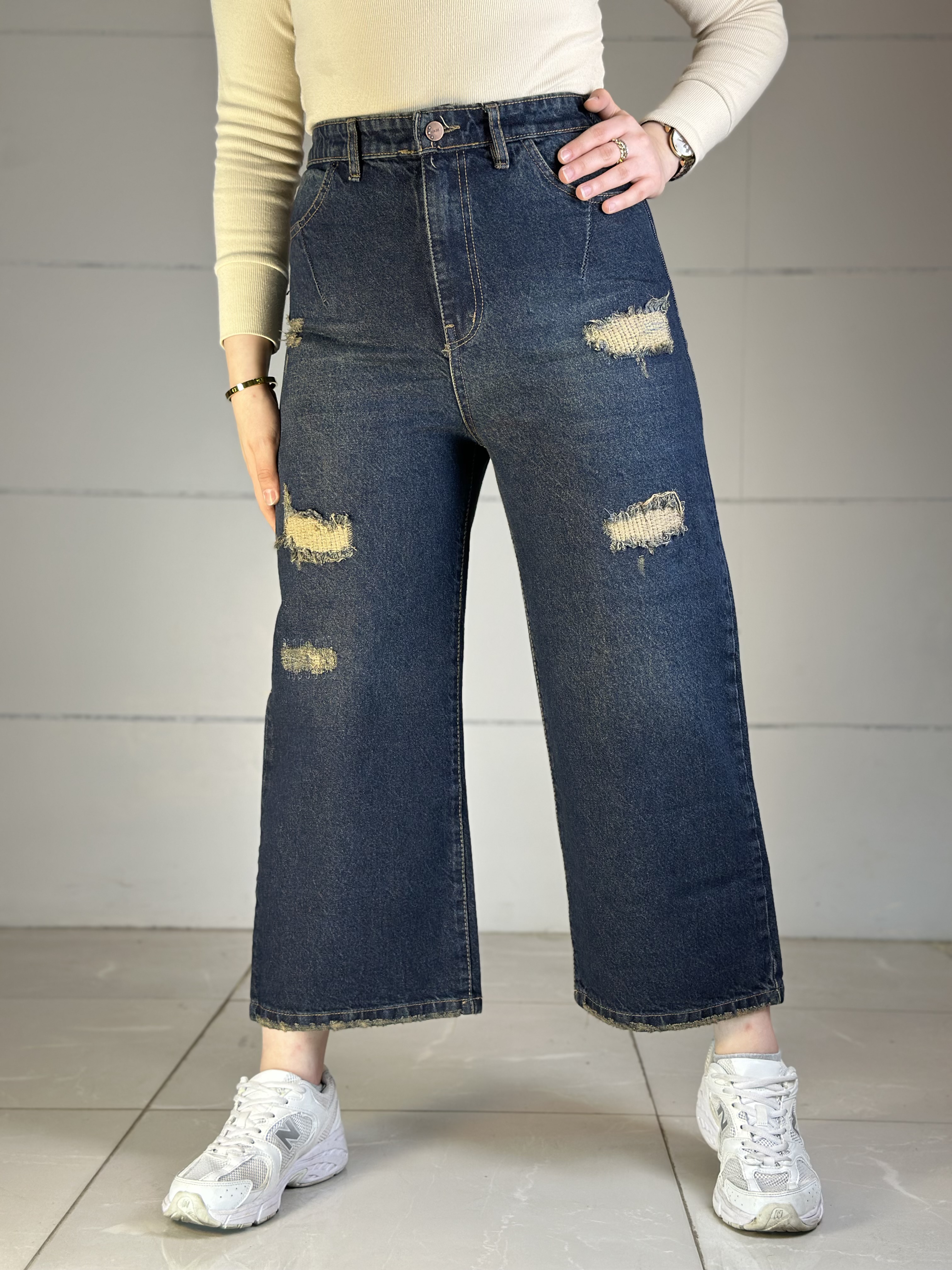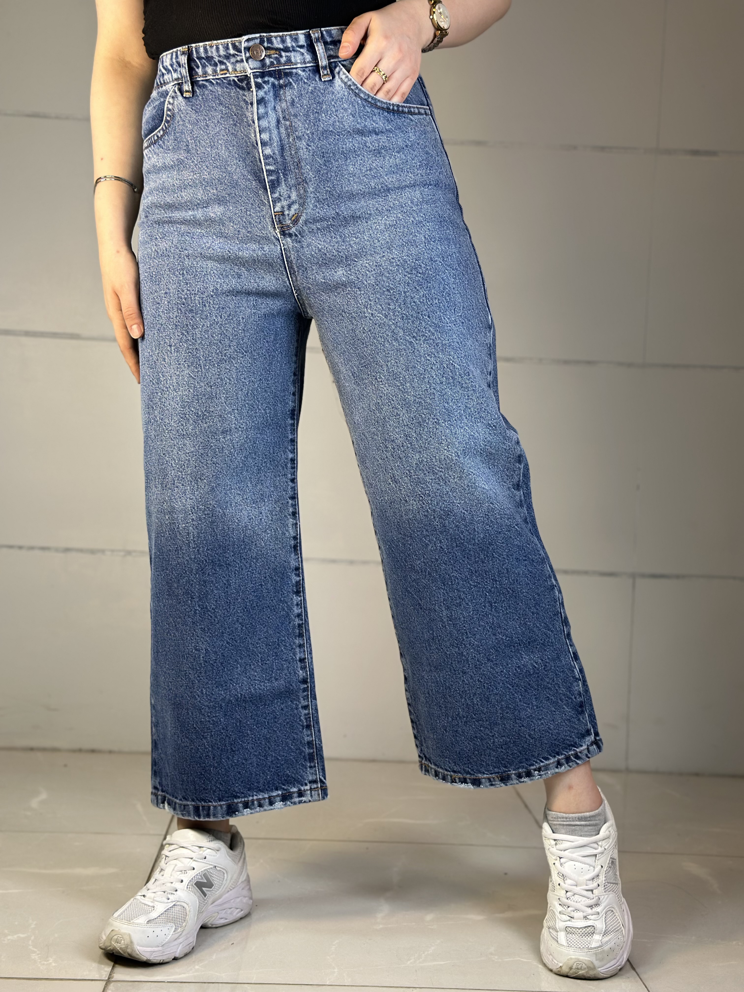 شلوار جین واید لگ پشت کش زاپدار سرمه ای سنگشور سایه روشن